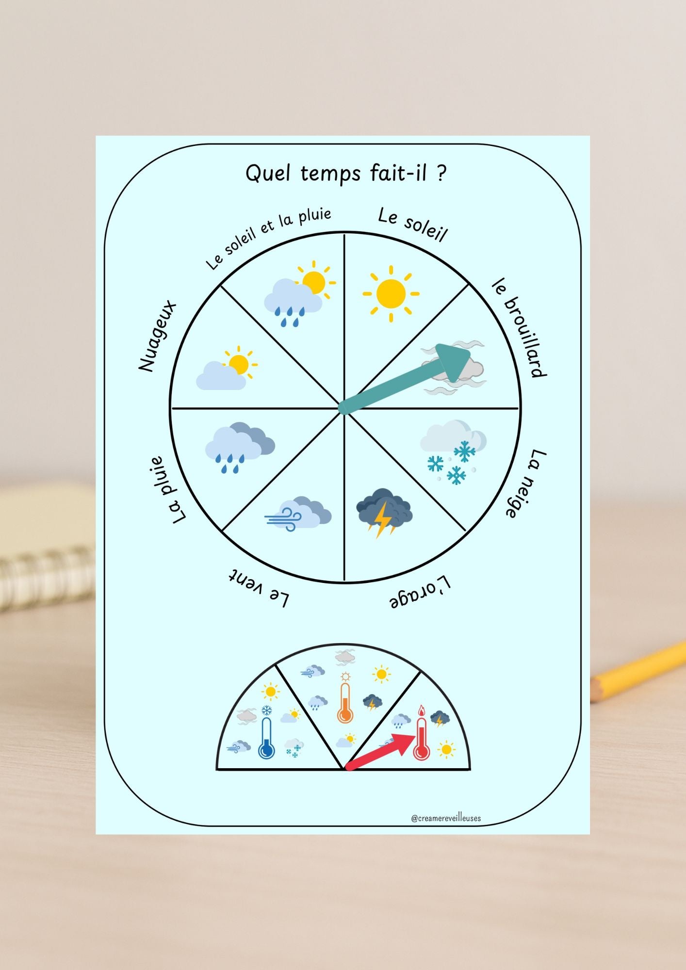Transforme la météo du jour en rituel ludique et éducatif ! L’enfant tourne les flèches pour indiquer le temps et la température, développant observation, vocabulaire et sens du temps 🧩
