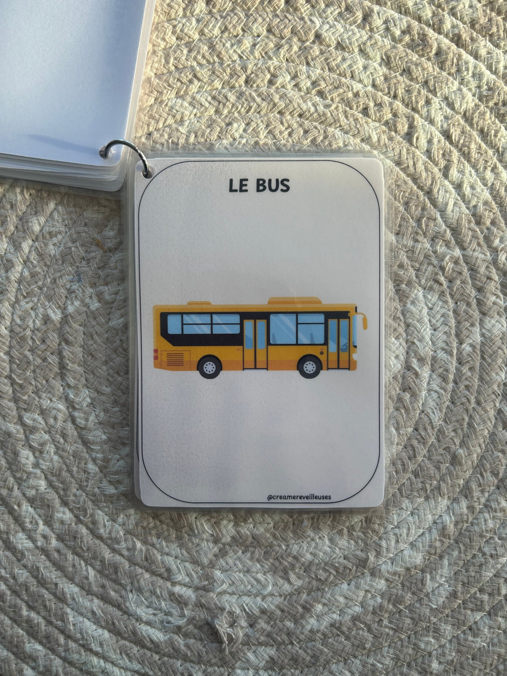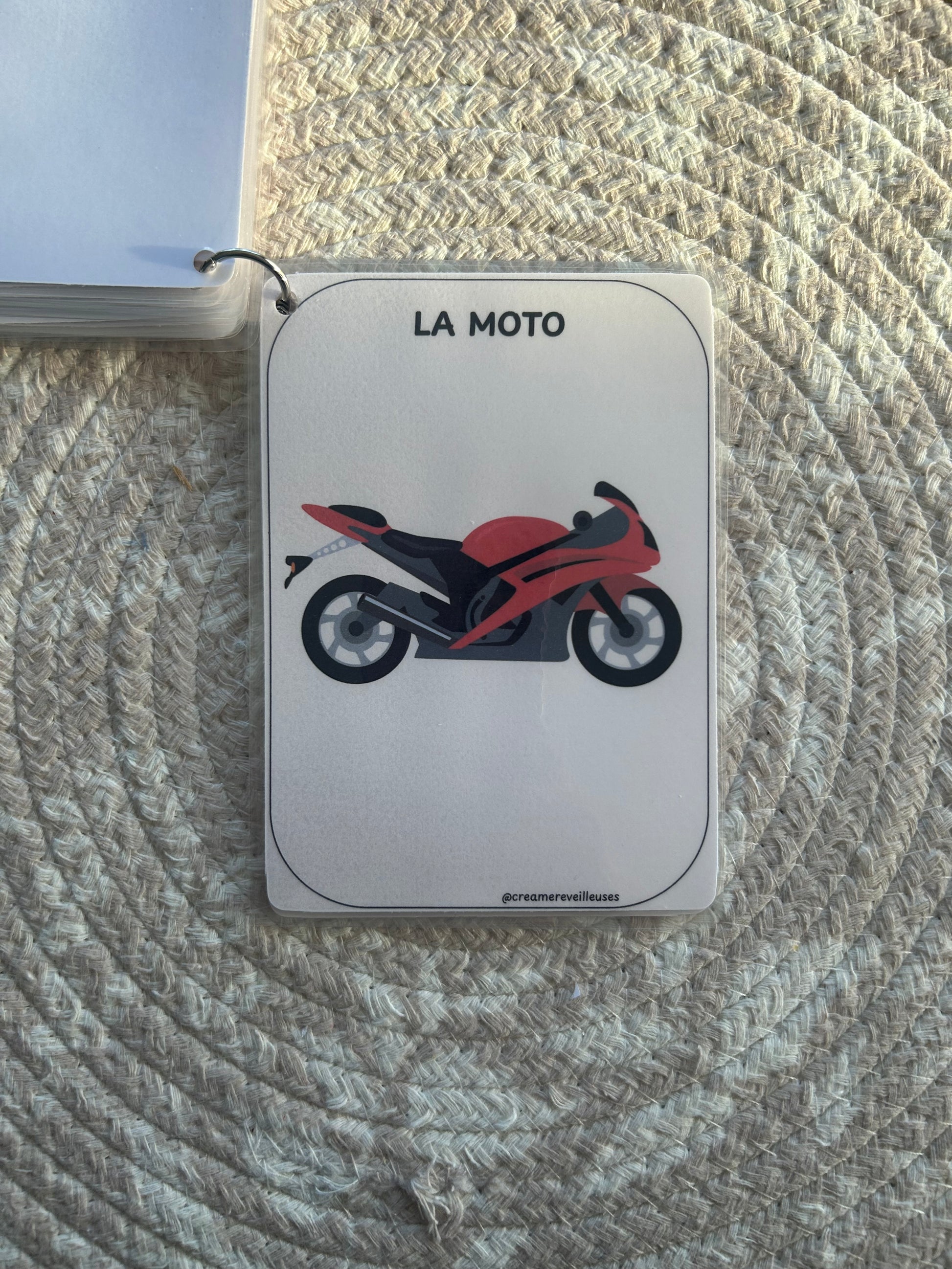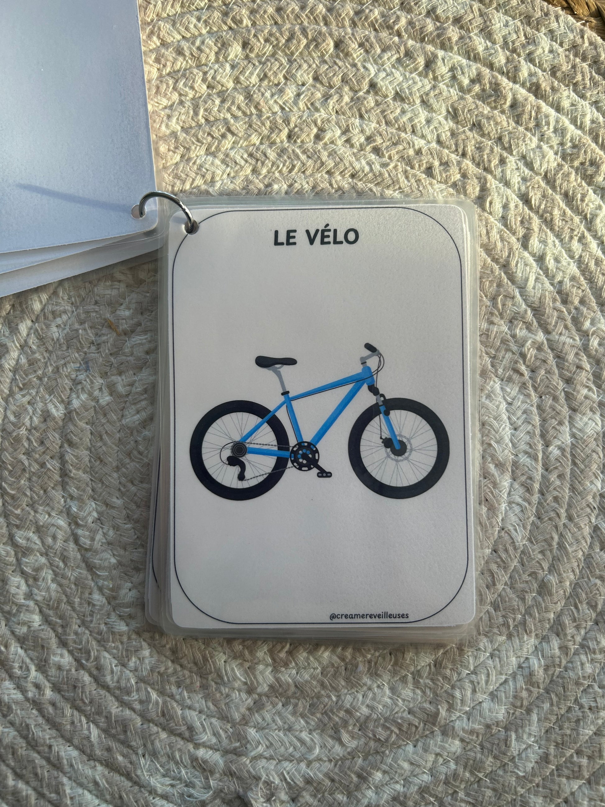 L’ensemble est relié par un anneau (au choix : métal ou silicone), ce qui permet de feuilleter facilement, d’emporter partout et de garder les cartes bien rangées.